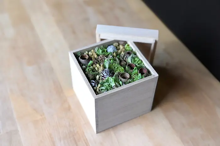 日本画の草木図が余白に込めた、静謐な祈り。京都の庭園を吹き抜ける四季の呼吸や、光の粒子を浴びる植物の揺らぎを、そのまま小箱の中に閉じ込めました。それは、広大な風景から最も純度の高い一瞬だけを掬い上げた、あなただけの「私的な庭」。箱を開ける行為は、閉じ込められた時間の封印を解き、一瞬にして別の場所へと意識を運ぶ、空間の再定義でもあります。