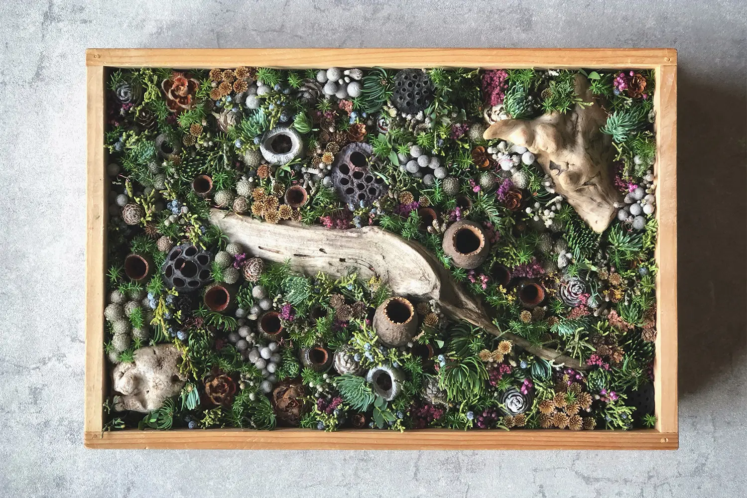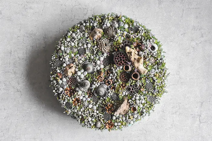 生態系が揺らぎ、情報が溢れる「蒼茫(そうぼう)とした混沌」の中で、未だ定義されていない未来の植物風景を具現化するシリーズ。生花と乾燥植物が複雑に絡み合う情景は、過去と未来、現実と幻想が交差する「草昧=未分化な始まり」の姿です。加速し続ける日常に対し、堆積する自然の重みを空間に静かに介入させます。