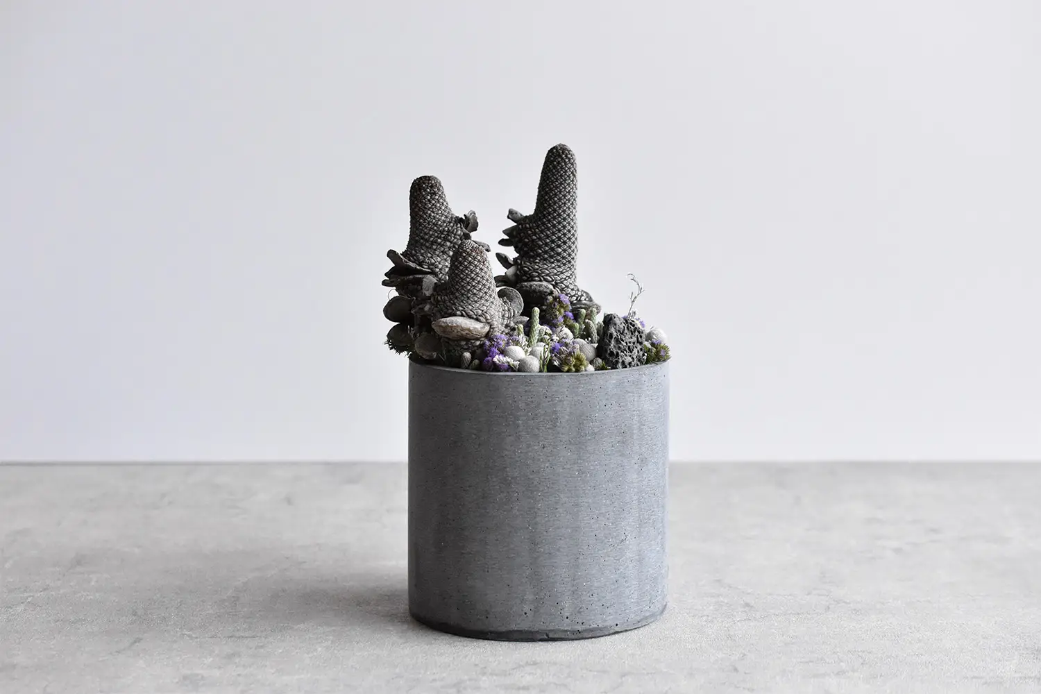 パスカルの哲学を背景に、器の設計からアプローチしたシリーズ。特徴的な脚部は、水面に自立する葦のように細く、しかし確かな意志を持って上部の庭園を支えます。そこに息づくのは、一輪の静寂ではなく、重なり合う植物たちの対話。日常の地平から切り離された空中庭園の中で、異なる形、異なる色を持つ命が混ざり合い、宇宙の縮図のような多層的な風景を構築しました。
