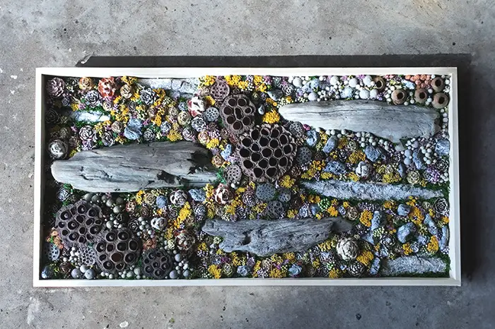 植物を「生命の象徴」ではなく、ある時間が圧縮された「物質」として再定義。花が咲き、枯れるプロセスを、地層のように重なり合う「断面」として扱います。一瞬の美しさではなく、堆積していく時間の奥行きそのものを造形化しました。