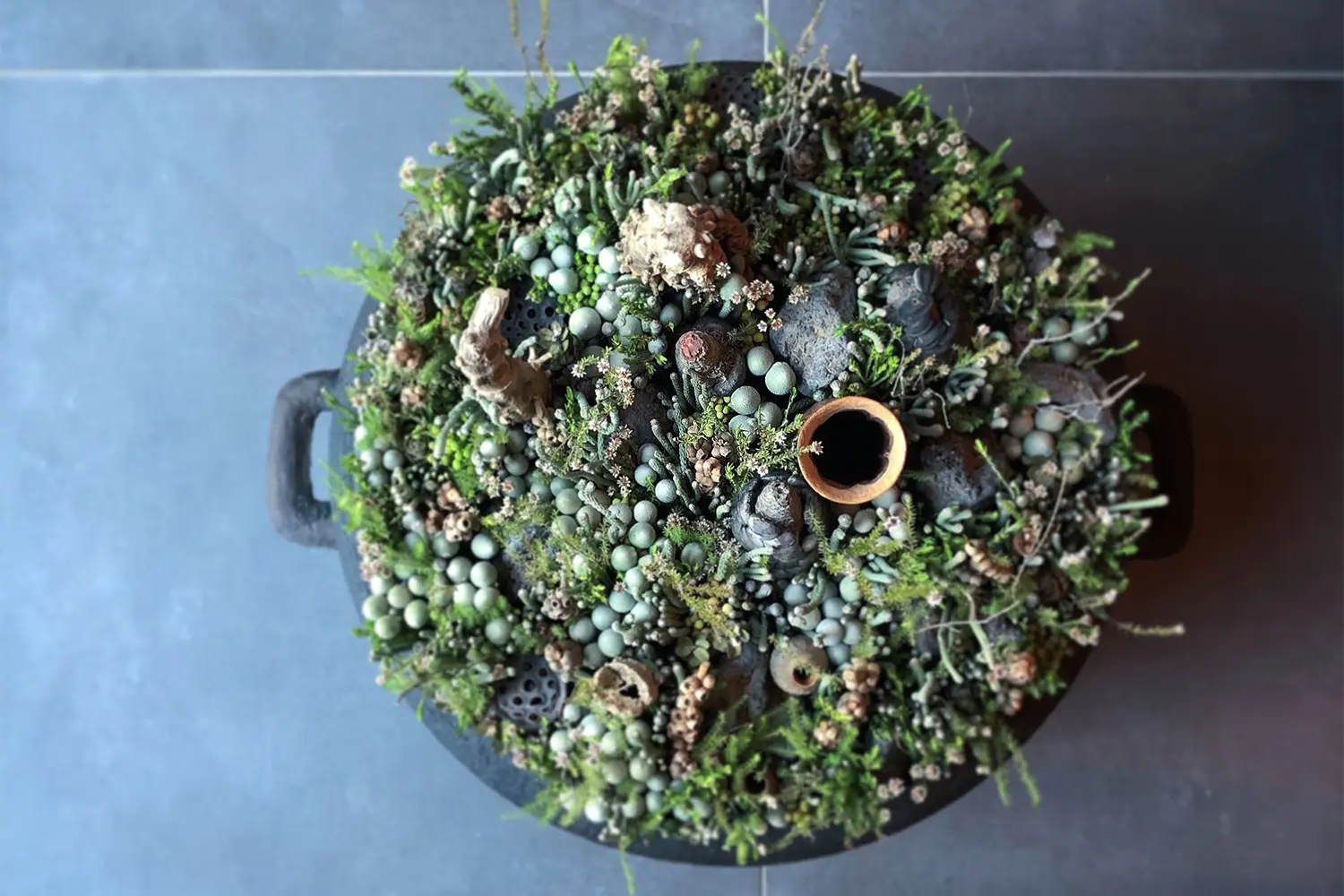古い骨董やマテリアルを「器」ではなく、「異界から流れ着いた文明の遺構」と見立てるシリーズ。そこに宿る植物の姿は、人知を超えた年月を経て、人工物が自然に抱きしめられ、一つに溶け合った終焉と再生の情景です。空間の中に、現実とは異なる時間軸を持つ「遺構」を出現させ、日常の裂け目に異世界の記憶を呼び覚まします。