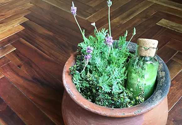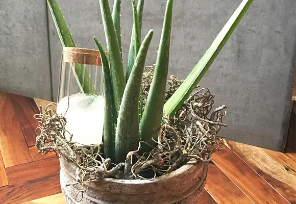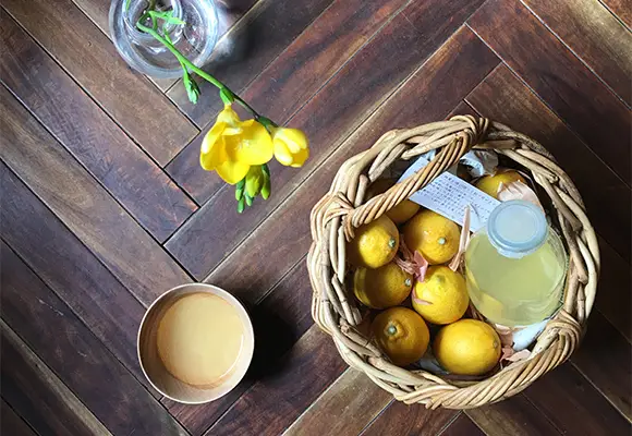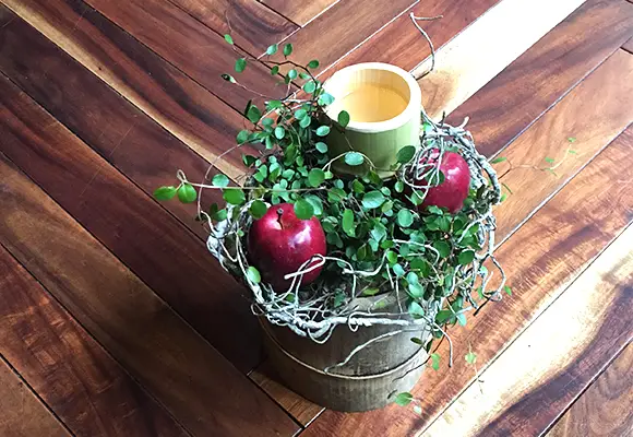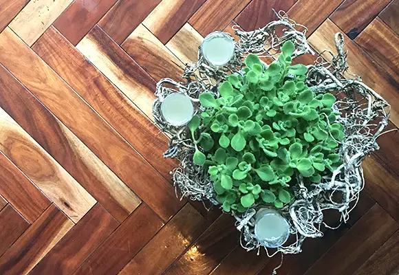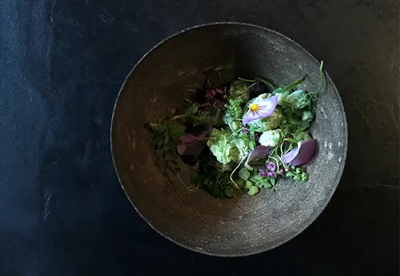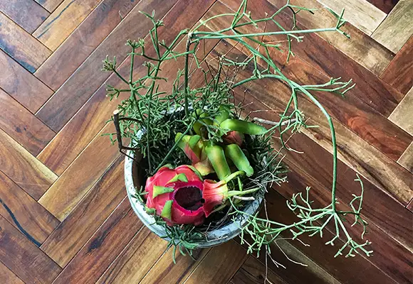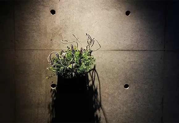 店内の植物装飾は、枝ものを中心に季節感を大切にしながらも、店舗で提供する飲料ペアリングコースのアプローチに合わせて定期的に変更しながら生け込みを行いました。店内の植物装飾を飲料プレゼンテーションの素材として活用。ユーカリを摘みブーケにグラスと共に巻き込んでブーケスタイルドリンクを仕上げたり。店内の装花から飲料の器を即興で作り季節感を演出。沢山のハーブを活け込んだ籠を器にして小さなハーブガーデンからお客様に摘んでドリンクとして提供など。実際に空間ディスプレイを提供商品に「参加させる」アプローチで空間装飾との繋がりを作り、視覚・味覚・嗅覚を通して体感する植物装飾にチャレンジする機会となりました。