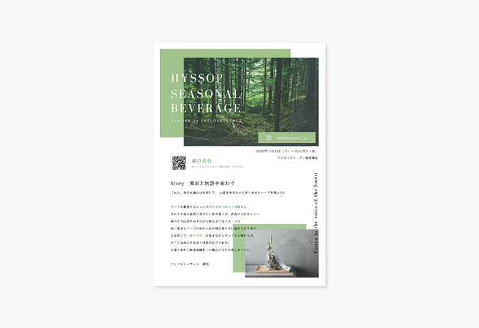 店舗の立ち上げから携わるHyssopのクリスマス限定商品としてアンフロレッサンスのボタニカルドリンク「STORY」を販売しました。現場でのオペレーション用に動画を制作。